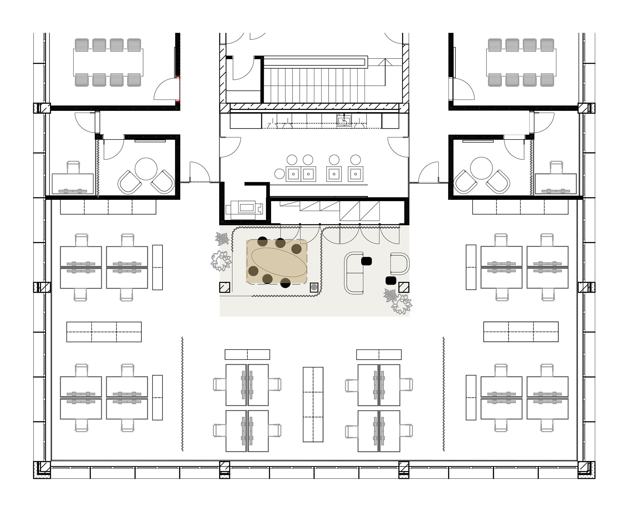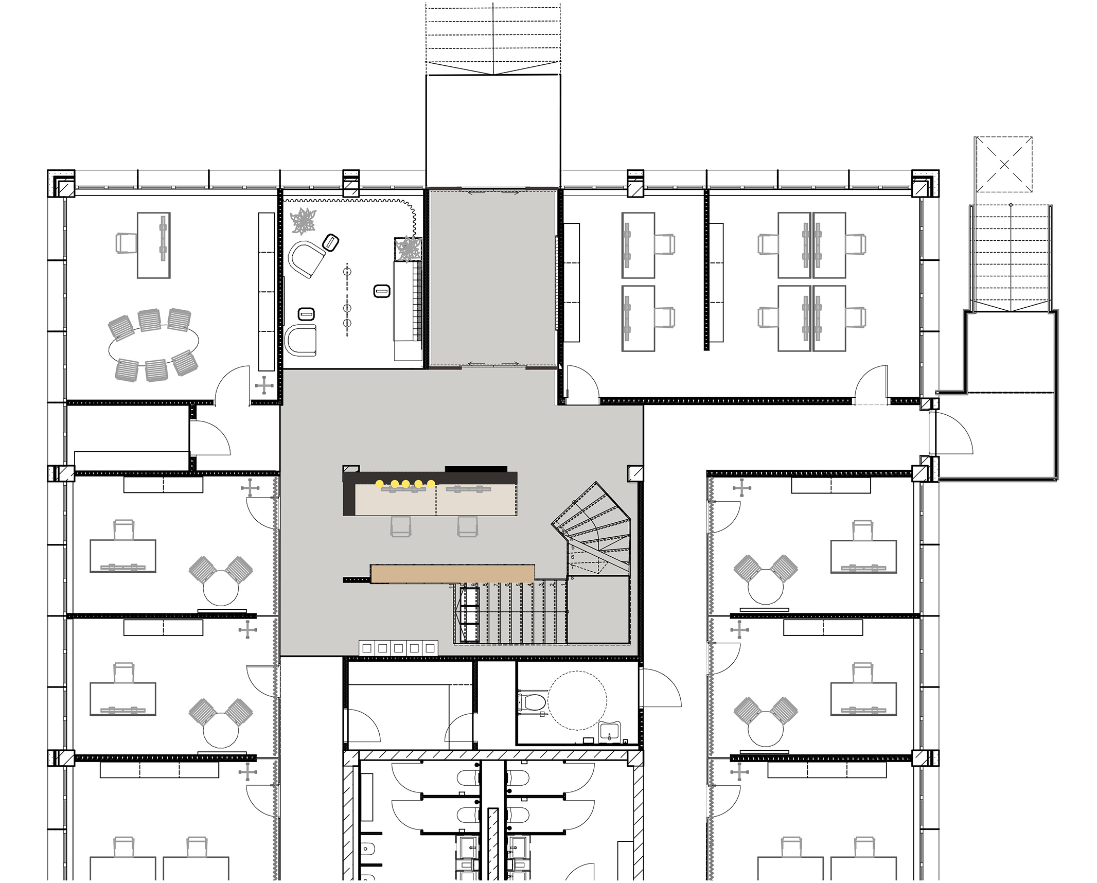 Designkonzept, Innenarchitektur sowie Planung und Umbau aeiner modernen Arbeitsfläche über drei Geschosse im Verwaltungsgebäude 45 in Unterradlberg
