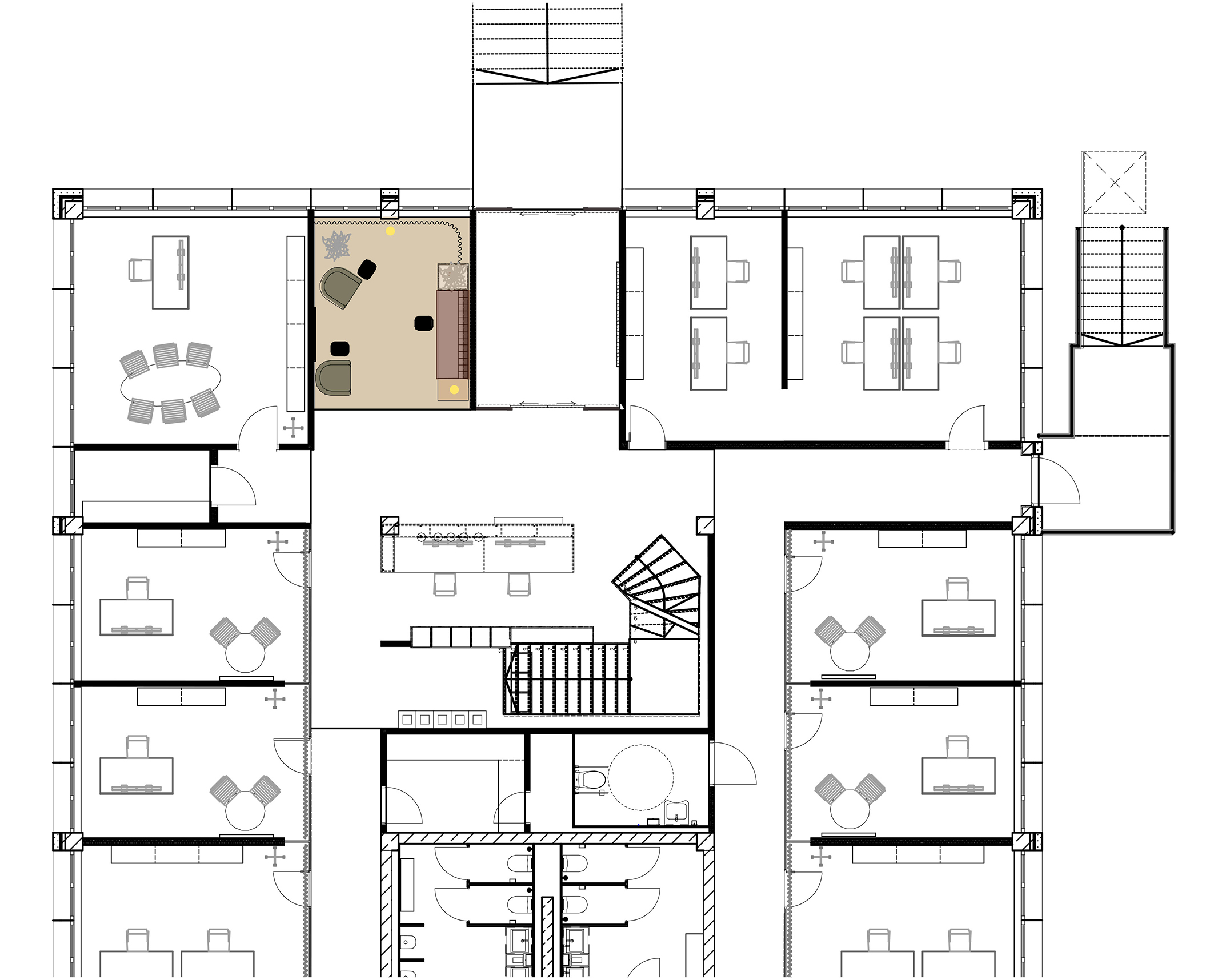 Auf rund 1.400 m² übersetzt Mint Architecture die im Stammhaus gewonnenen Erfahrungen in die zweite Umsetzung des New-Work-Konzepts im Verwaltungsgebäude Unterradlberg. Im Mittelpunkt stand die Schaffung einer flexiblen und inspirierende Arbeitsumgebung, die vielfältige Nutzungsformen ermöglicht und unterschiedlichen Bedürfnissen der Mitarbeitenden gerecht wird. Dafür gliedern die Architekten die neu gestalteten Bereiche in unterschiedliche Zonen und Arbeitsplatztypologien: Von personalisierten Einzel- und Geschäftsführungsbüros über offene, nicht personalisierte Arbeitsplätze bis hin zu Meetingräumen, Chat- und Hybrid-Boxen und Flex-Hybrid-Arbeitsplätzen sowie einer Teeküche und Bibliothek.