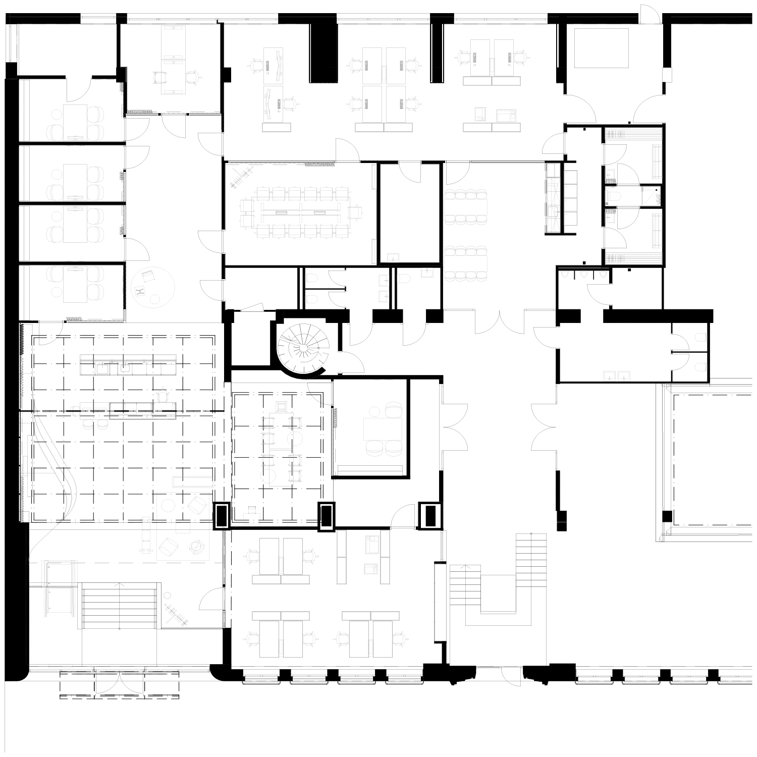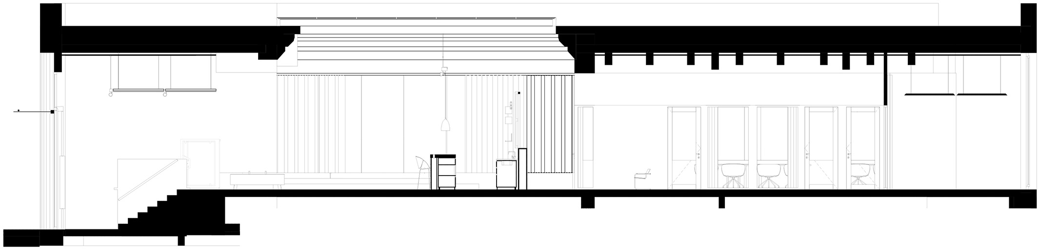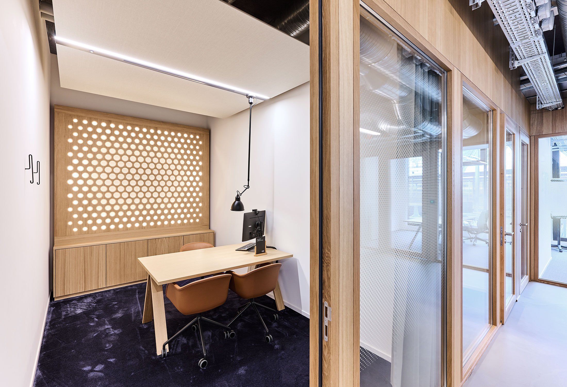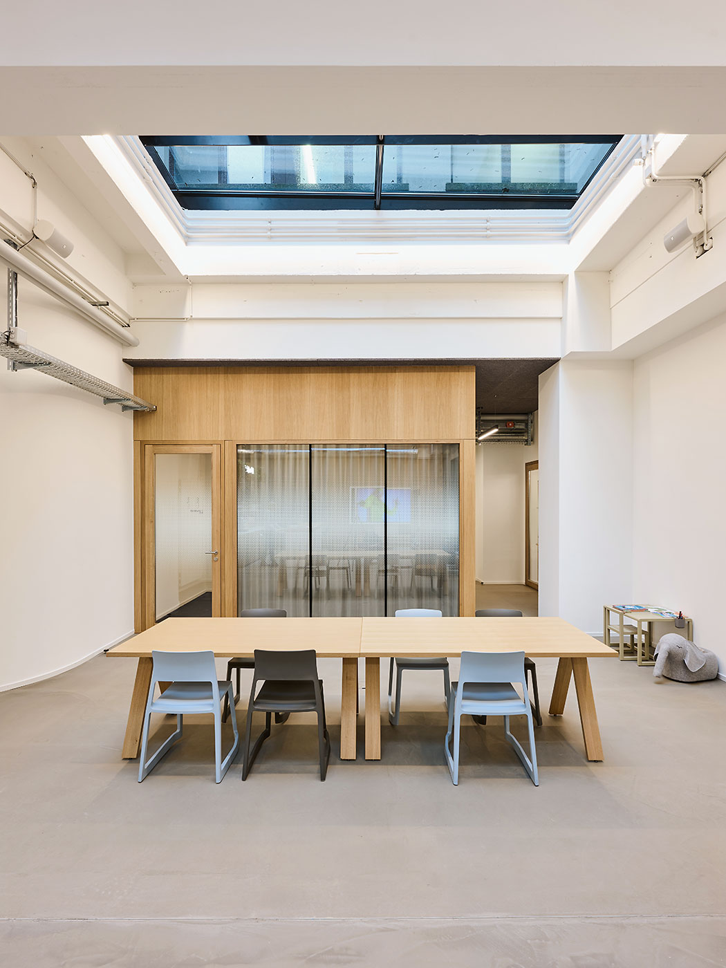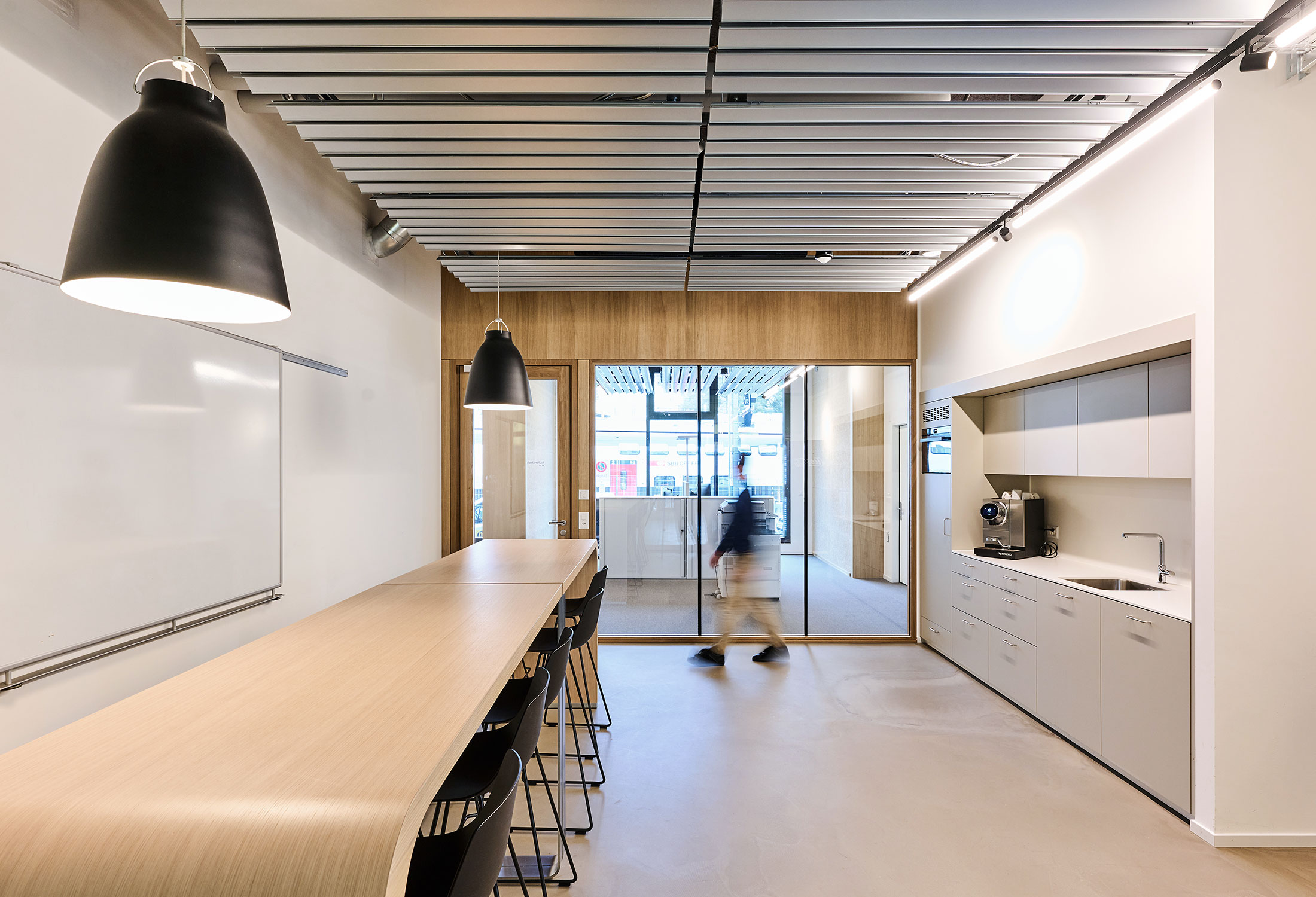 Entsprechend der architektonischen Gegebenheiten wird das Herzstück der Filiale mit einem grosszügigen Empfangsbereich, einem offenen Beratungsbereich sowie entspannten Sitz- und Besprechungsmöglichkeiten rund um die Oberlichter gestaltet. Die helle je nach Tageszeit und Witterung lichtdurchflutete Fläche wird seitlich und im hinteren Bereich durch verschiedene kleinere Besprechungsräume ergänzt. Neben dem Empfangsbereich und im hinteren Bereich des Gebäudes befindet sich die Mitarbeiterzone mit Open-Space-Arbeitsplätzen, die Zugang zur gemeinsamen Teeküche bieten. Alle Türen sind verglast und verfügen je nach Raum über einen textilen und/oder applizierten Sichtschutz.